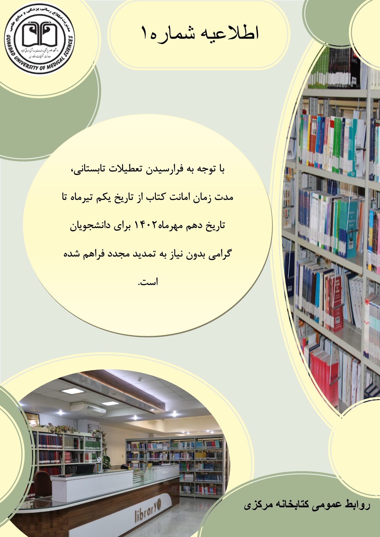 با توجه به فرارسیدن تعطیلات تابستانی، مدت زمان امانت کتاب از تاریخ یکم تیرماه تا تاریخ دهم مهرماه1402 برای دانشجویان گرامی بدون نیاز به تمدید مجدد فراهم شده است.